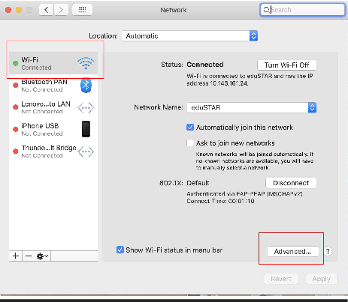 Goto > System Preferences. Click the “Network” icon. Select > Wi-Fi and Click Advanced