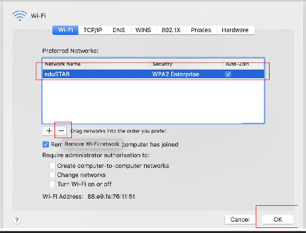 Step 4. Select the eduSTAR network and remove it by clicking on the - (minus) sign (Note! If the eduSTAR network is not listed under the Preferred Networks cancel and go to Step 6)